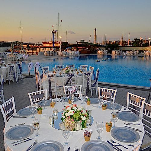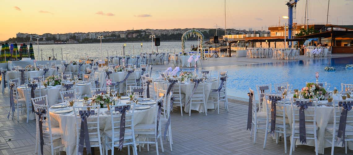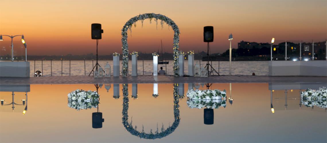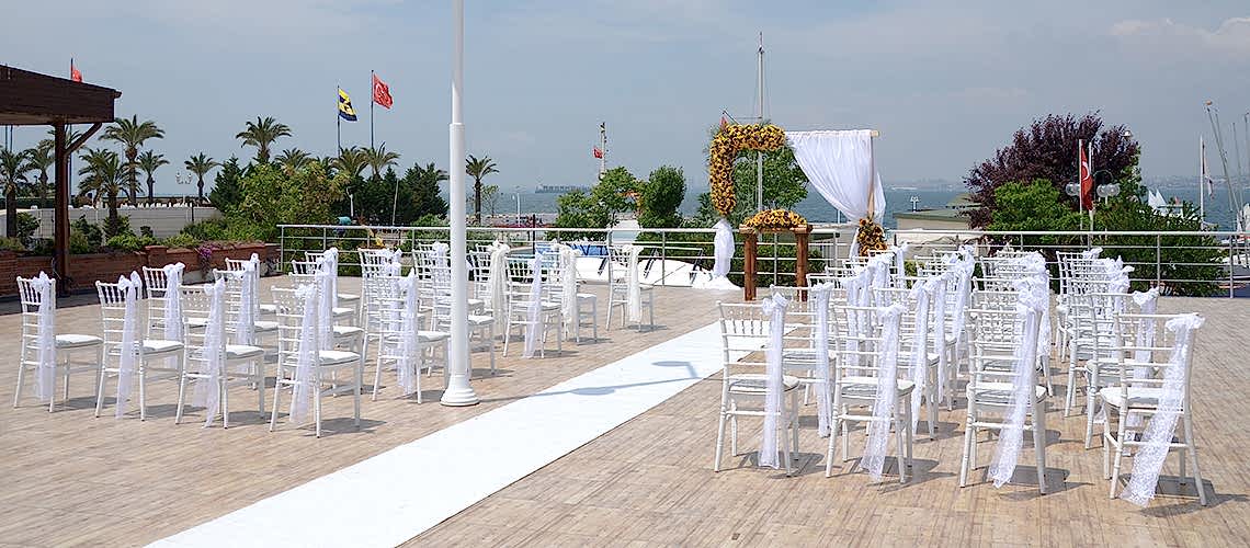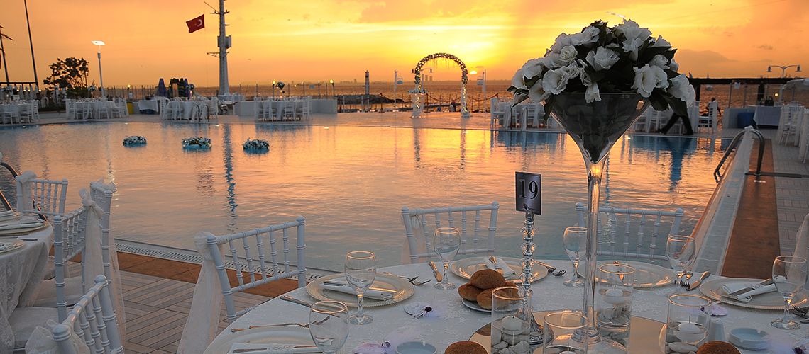 Kulübümüz havuz başı, 450 kişiye kadar olan düğün ve kokteyl organizasyonlarınız için Kalamış koyu, Moda burnu ve Istanbul Avrupa yakası manzarasına eşlik eden eşsiz gün batımı ile hizmetinizdedir.